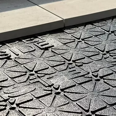 • Płyta jest perforowana, co pozwala wodzie wpłynąć do wnętrza konstrukcji, wypłynąć pod spodem i przemieszczać się swobodnie do odpływów lub na warstwę hydroizolacji.