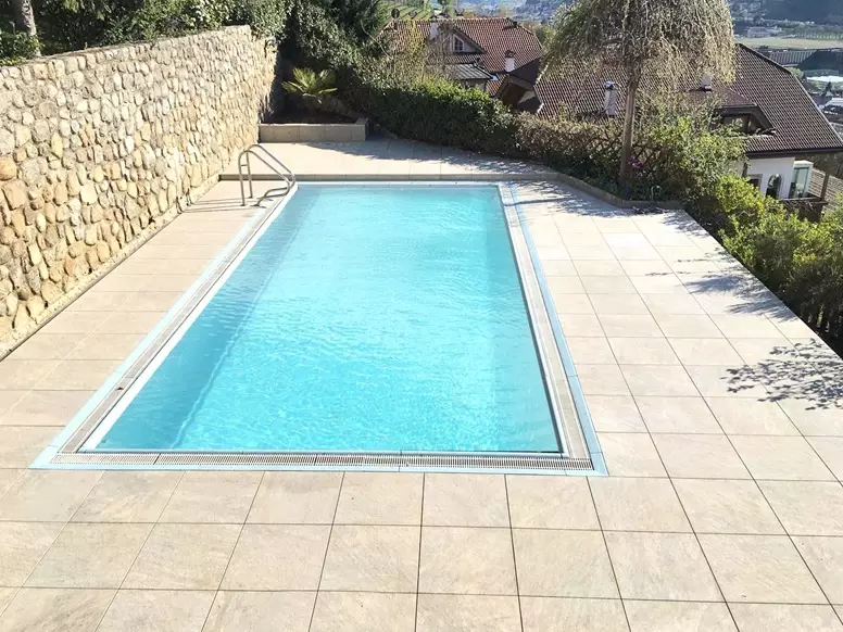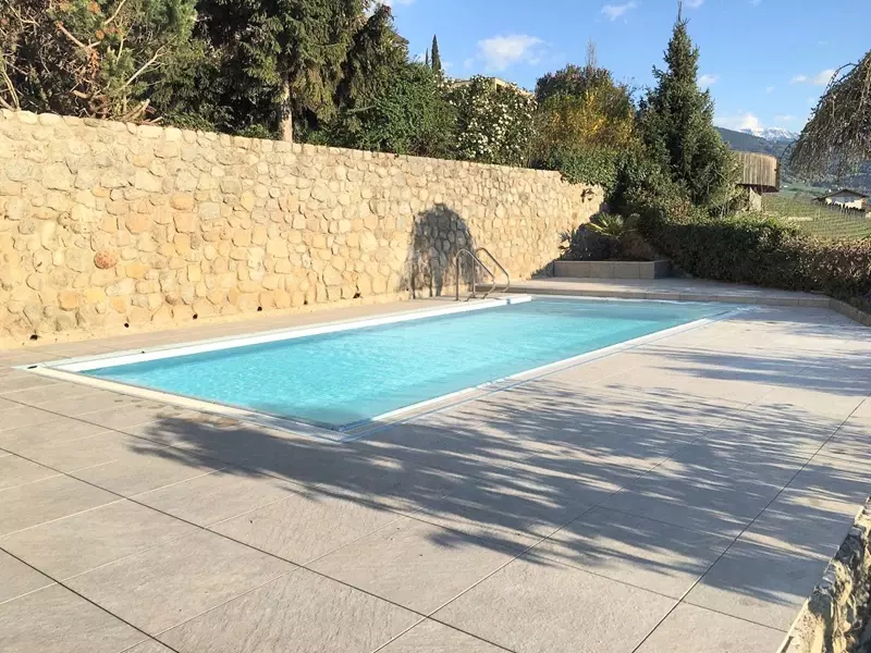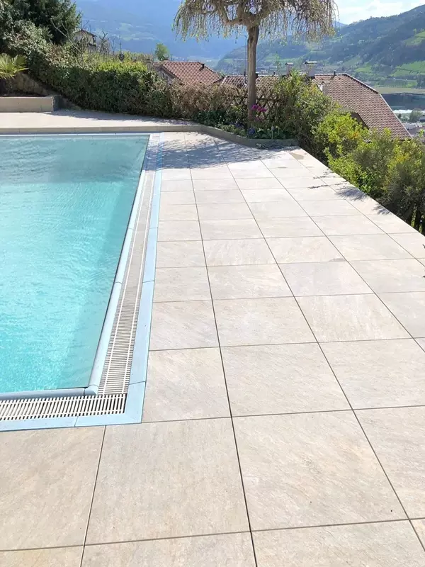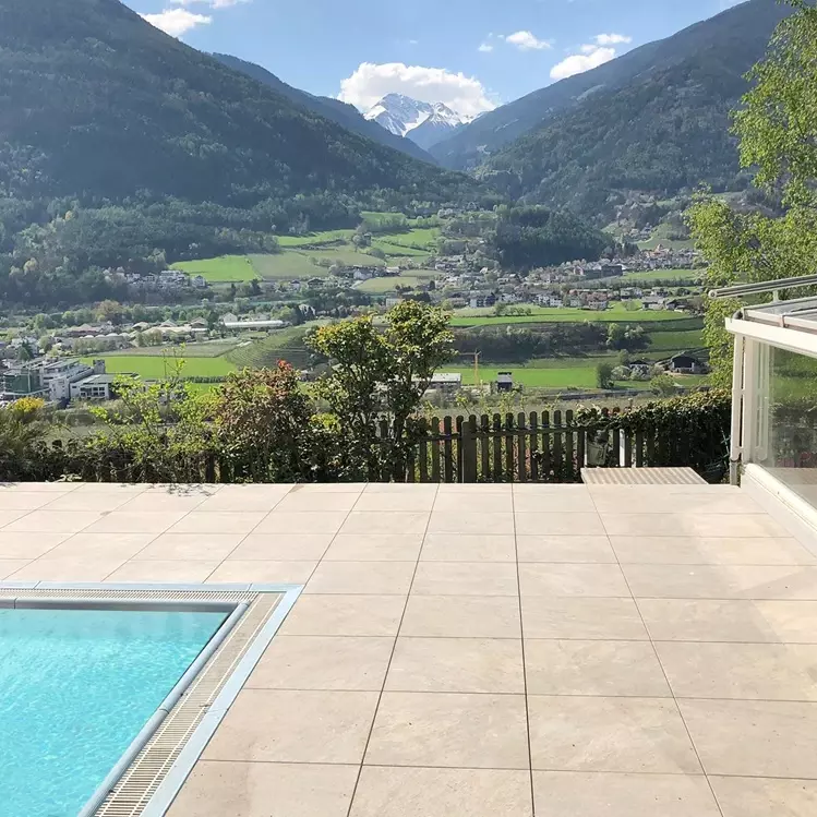 W willi w Bolzano, we Włoszech, zastosowano beżowe płytki tarasowe odporne na wilgoć i mrozoodporne. Płytki ułożono wokół basenu oraz na tarasie.