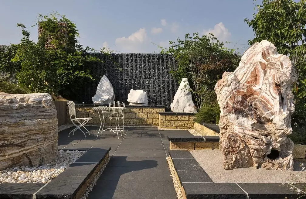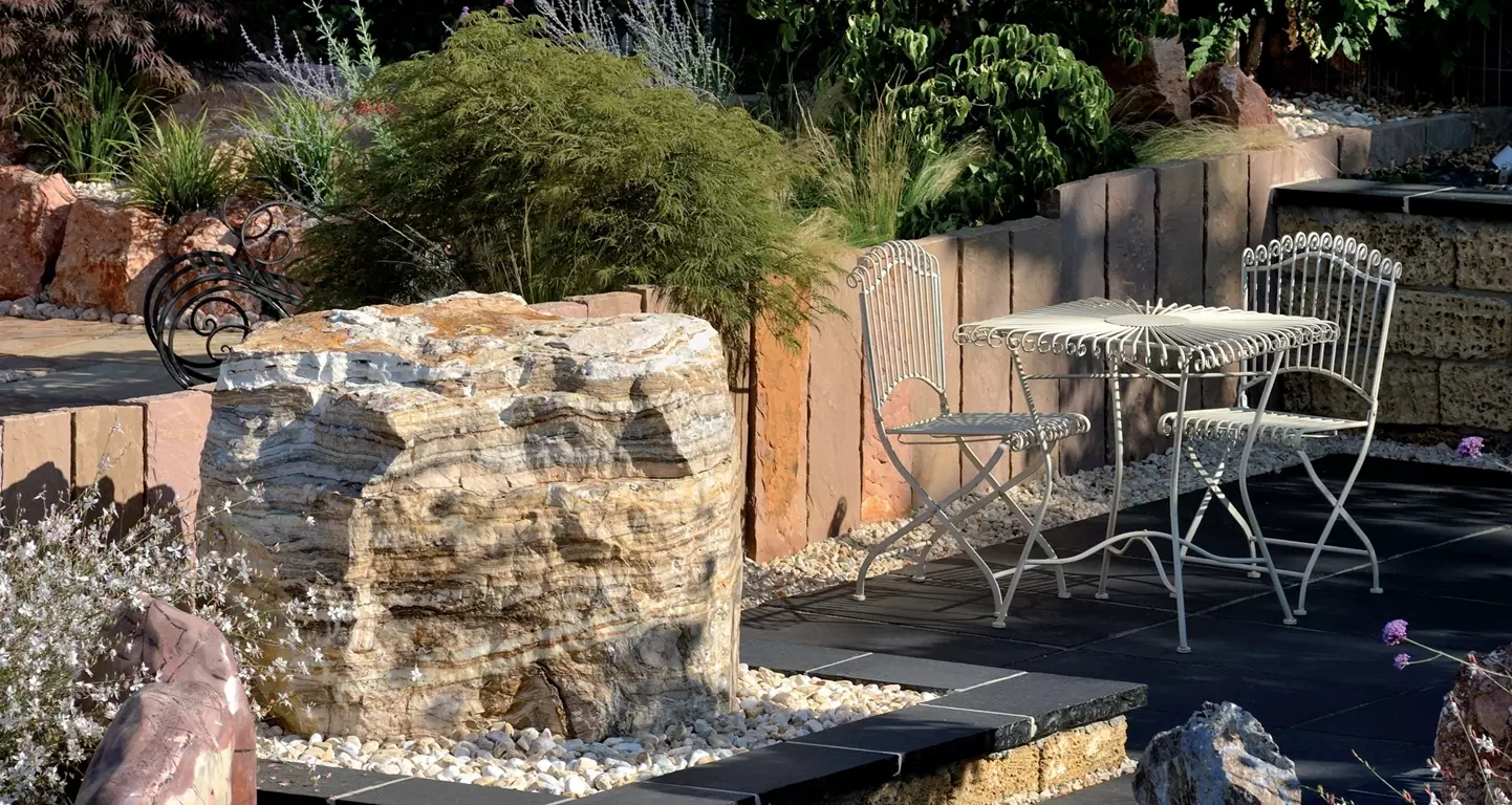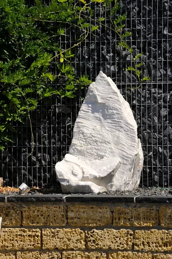 Monolity te są surowe, nieociosane i prawdziwe. Stanowią one pionowy kontrapunkt dla horyzontalnego układu czarnych płyt kamiennych. Ich interakcja z otoczeniem – to, jak rzucają długie cienie na czarny taras o zachodzie słońca – sprawia, że ogród żyje własnym rytmem, niezależnym od człowieka.