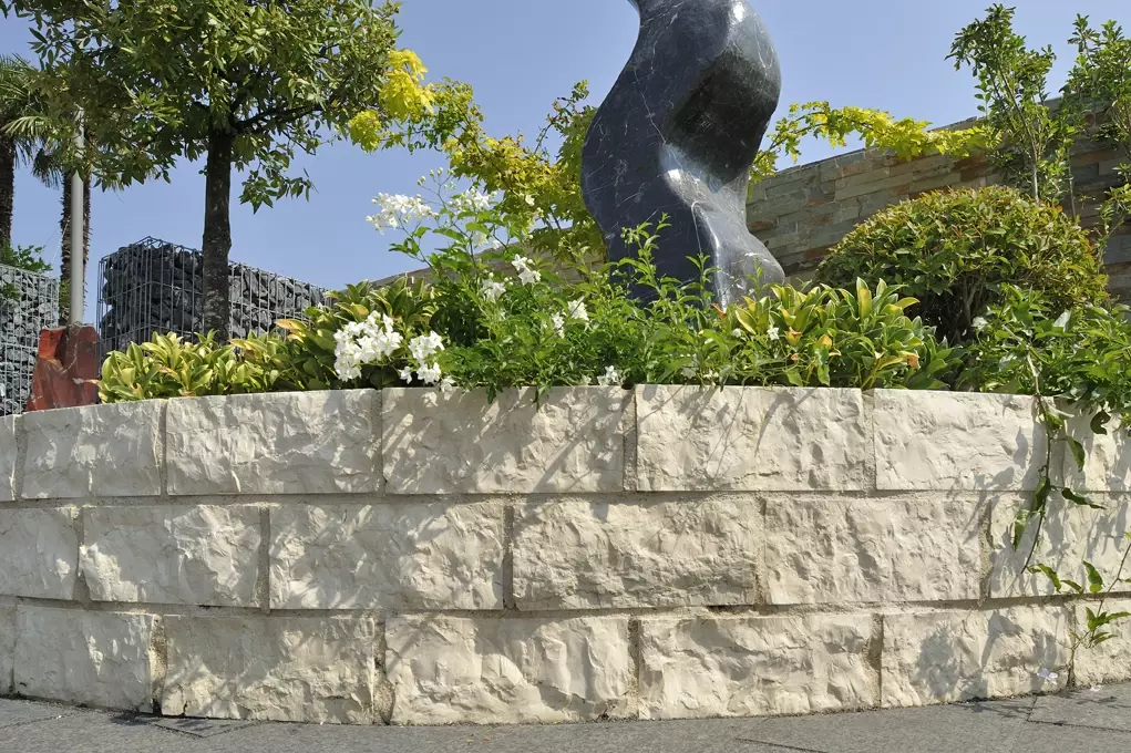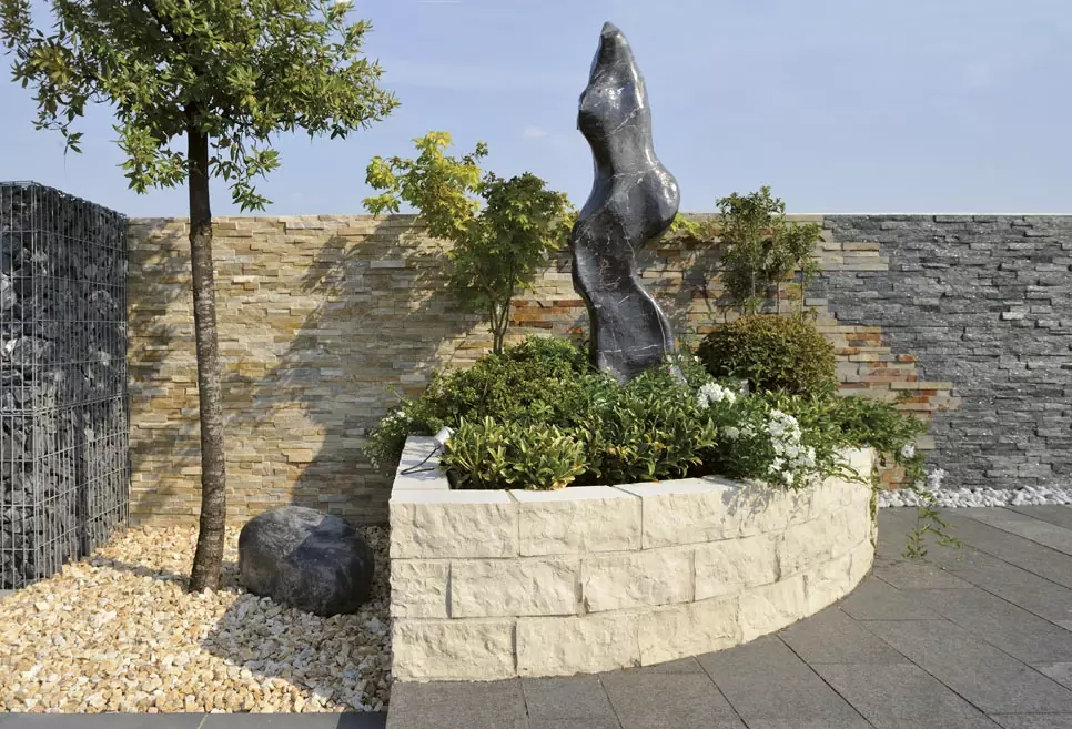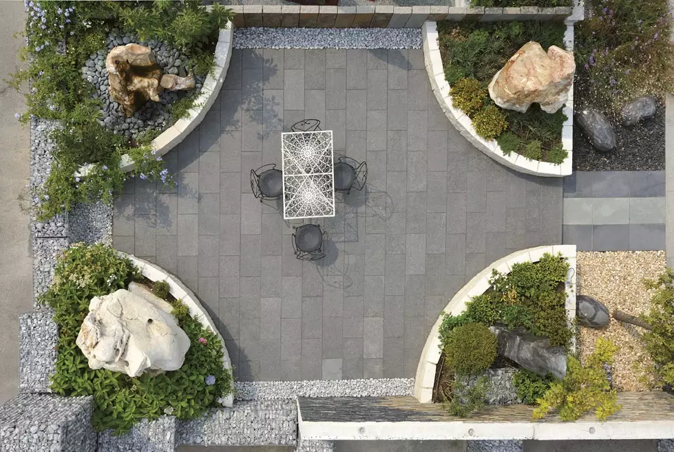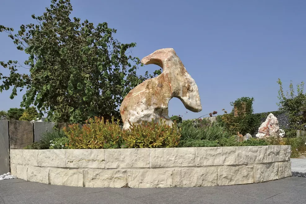 To, co nadaje tej realizacji unikatowości na skalę światową, to układ czterech półkolistych donic. Ich konstrukcja opiera się na kamieniu Triani w kolorze lilii – materiale o rzadkiej, szlachetnej barwie, która ożywa w słońcu. Jasne bloki Triani tworzą monumentalne obramowanie, które oddziela strefę wypoczynku od reszty ogrodu.