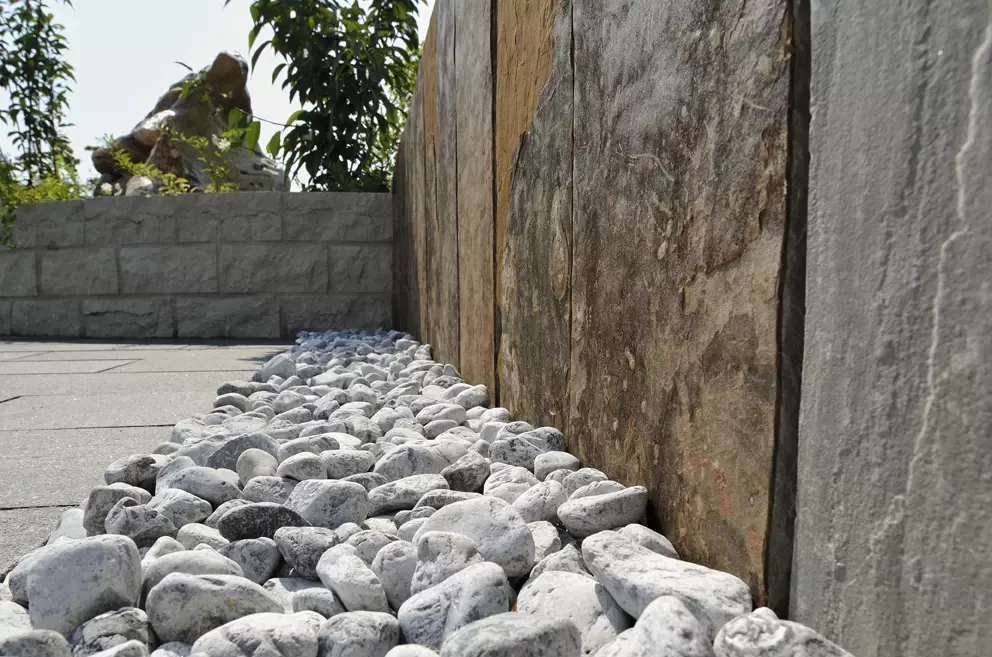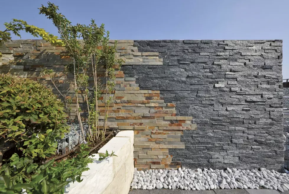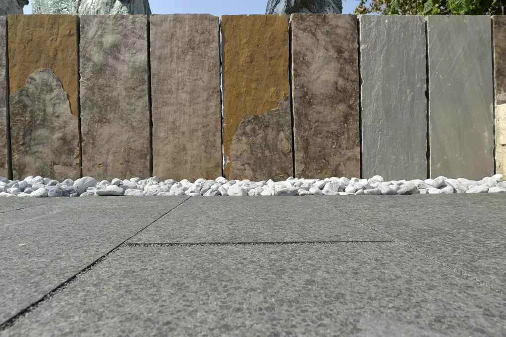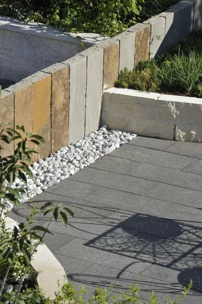 Łącznikiem między jasnymi blokami a ciemną podłogą są palisady z płyt łupkowych. Ich warstwowa, pionowa struktura wprowadza niezbędny dynamizm. To zestawienie dwóch skrajności – gładkiego Triani i poszarpanego łupka – sprawia, że taras staje się trójwymiarową rzeźbą użytkową.