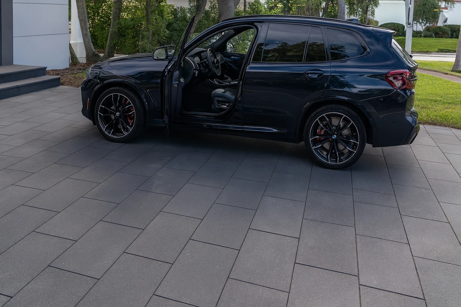 Podjazd z wielkoformatowych płyt gresowych daje efekt wizualny, który do tej pory był nieznany. Minimalna ilość fug, idealnie równe krawędzie i duże formaty sprawiają, że nawierzchnia wygląda jak jednolita, monolityczna płyta architektoniczna. To zupełnie inna jakość odbioru przestrzeni – nowoczesna, luksusowa i spójna z aktualnymi trendami architektury premium.