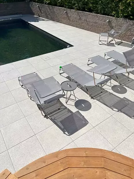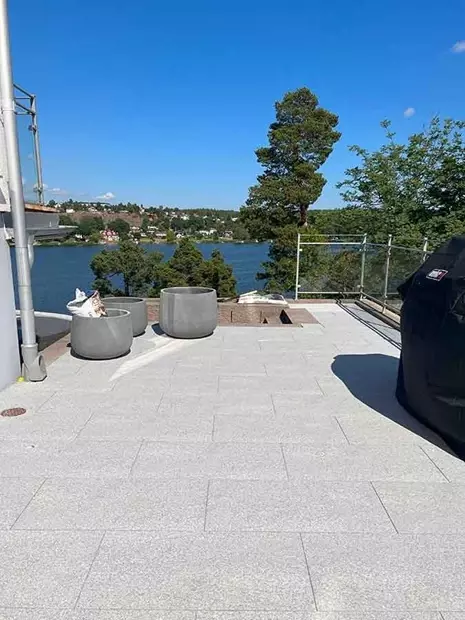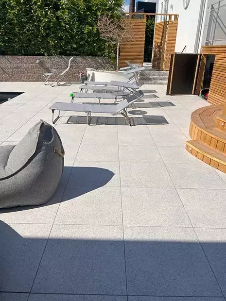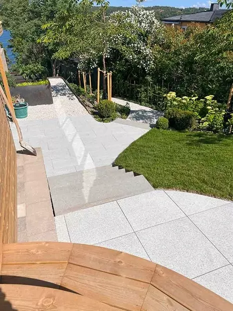 Zdjęcie z salonu Płytka tarasowa wiernie odtwarza jasnoszary granit znany powszechnie z eleganckiej, jasnoszarej barwy i drobnoziarnistej, jednolitej struktury. Jej powierzchnia podkreśla naturalny wygląd granitu, tworząc estetyczny i spójny efekt zarówno na tarasach, balkonach..